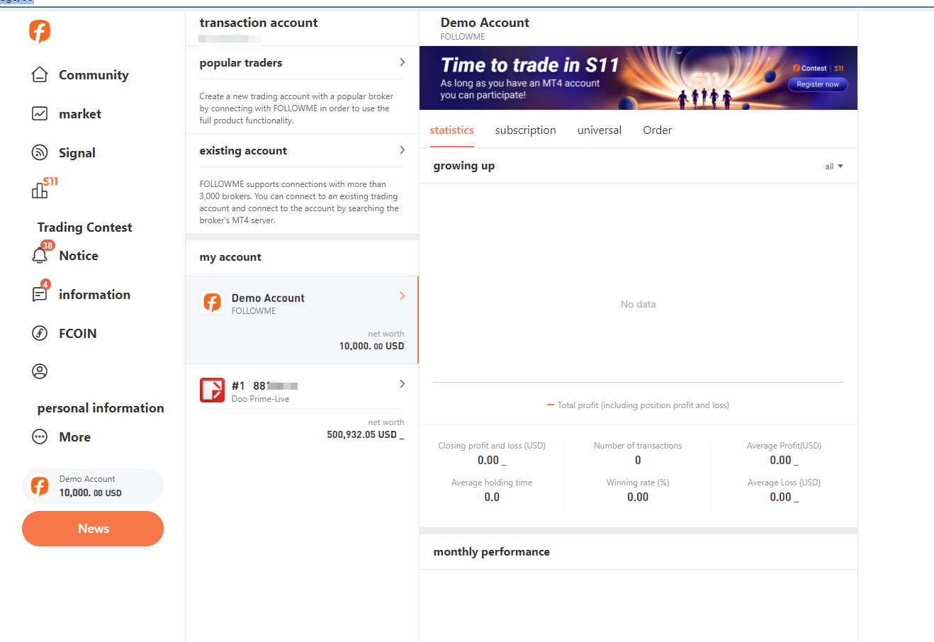 بعد أن يقوم العميل بتسجيل الدخول إلى FOLLOWME، انقر فوق "ربط الحساب" على الجانب الأيمن من الصفحة الرئيسية وابحث عن D Prime في صفحة ربط حساب التداول.