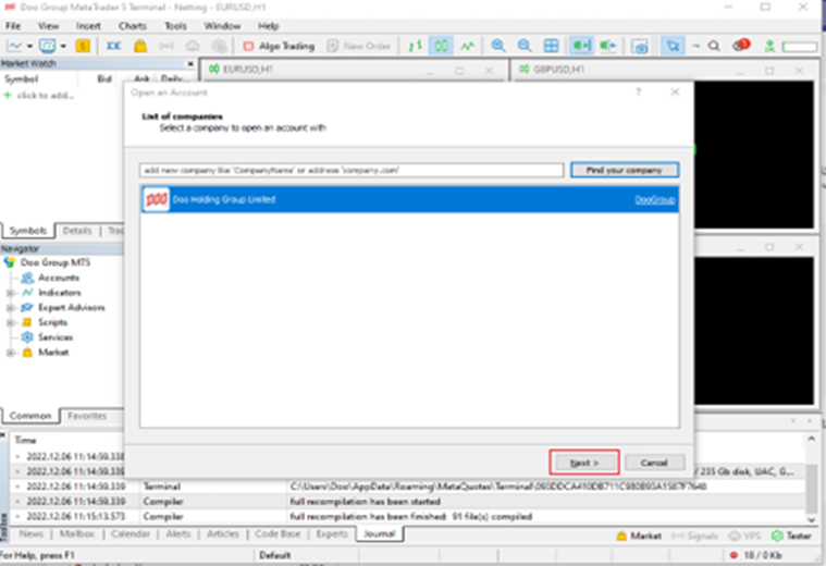 Double-click to open MT5, select [Login to Trading Account] in the top menu bar [File], then search for the specified trading server, and click [Continue]