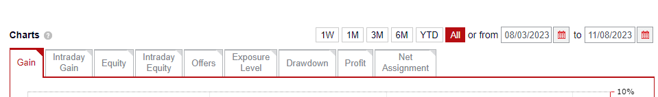 c. Si el usuario desea crear una cotización o administrar la configuración de una cuenta maestra, haga clic en la cuenta maestra deseada en la lista de cuentas activas para obtener más detalles. El sistema generará gráficos que muestran ganancias, ganancias del día, capital, cotizaciones, niveles de exposición, retiros máximos, ganancias y distribuciones netas para la cuenta maestra seleccionada.