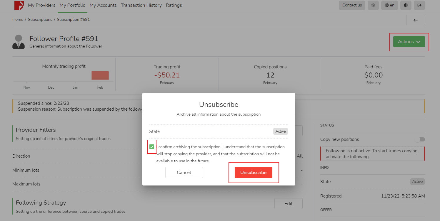 Si los seguidores quieren dejar de seguir, deben hacer clic en el botón rojo [Cancelar suscripción].