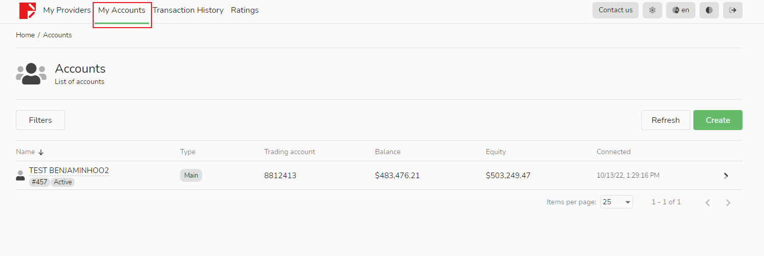 En la página [Mi cuenta] de la fuente de la señal, puede agregar una nueva cuenta comercial haciendo clic en el botón verde [Crear]. Sin embargo, esta cuenta no se puede utilizar para iniciar sesión y solo se puede seleccionar como fuente de señal, seguidor o configurada para recibir tarifas de rendimiento.
