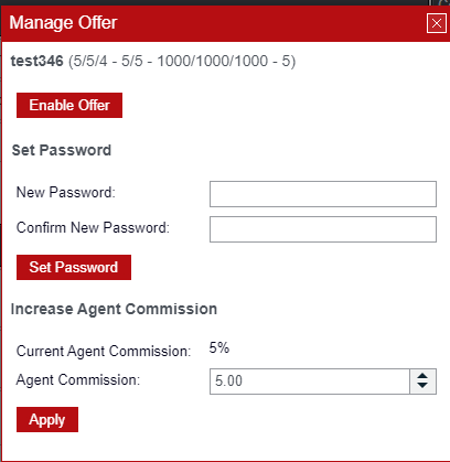 d. Para cambiar la "Comisión de Agencia" y/o la "Contraseña", haga clic en "Administrar" en la tabla "Cotizaciones y Seguidores". Seleccione "Desactivar" o "Activar cotización" para cambiar el estado de la cotización.