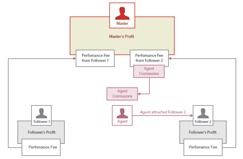 La comisión de agencia se refiere a la comisión por la que una cierta proporción de la "tarifa de rendimiento" de la cuenta maestra se transfiere a la cuenta de la agencia al final del intervalo comercial, cuando las ganancias se dividen entre la cuenta maestra y los seguidores. El tamaño de la comisión del agente (expresado como porcentaje) lo establece la cuenta maestra.