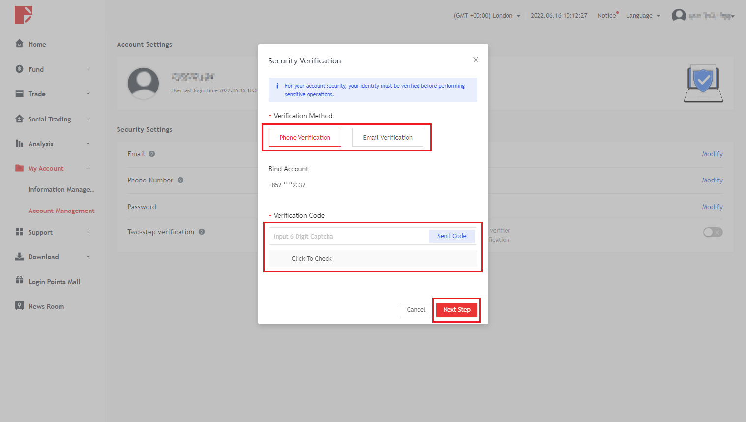 2. 인증할 휴대폰 또는 이메일을 선택하고 "확인하려면 클릭하세요"를 클릭할 수 있습니다. 인증 후 시스템에서 휴대폰 정보 또는 이메일을 통해 인증 코드를 전송합니다. 인증 코드를 입력하고 "다음"을 클릭하십시오.