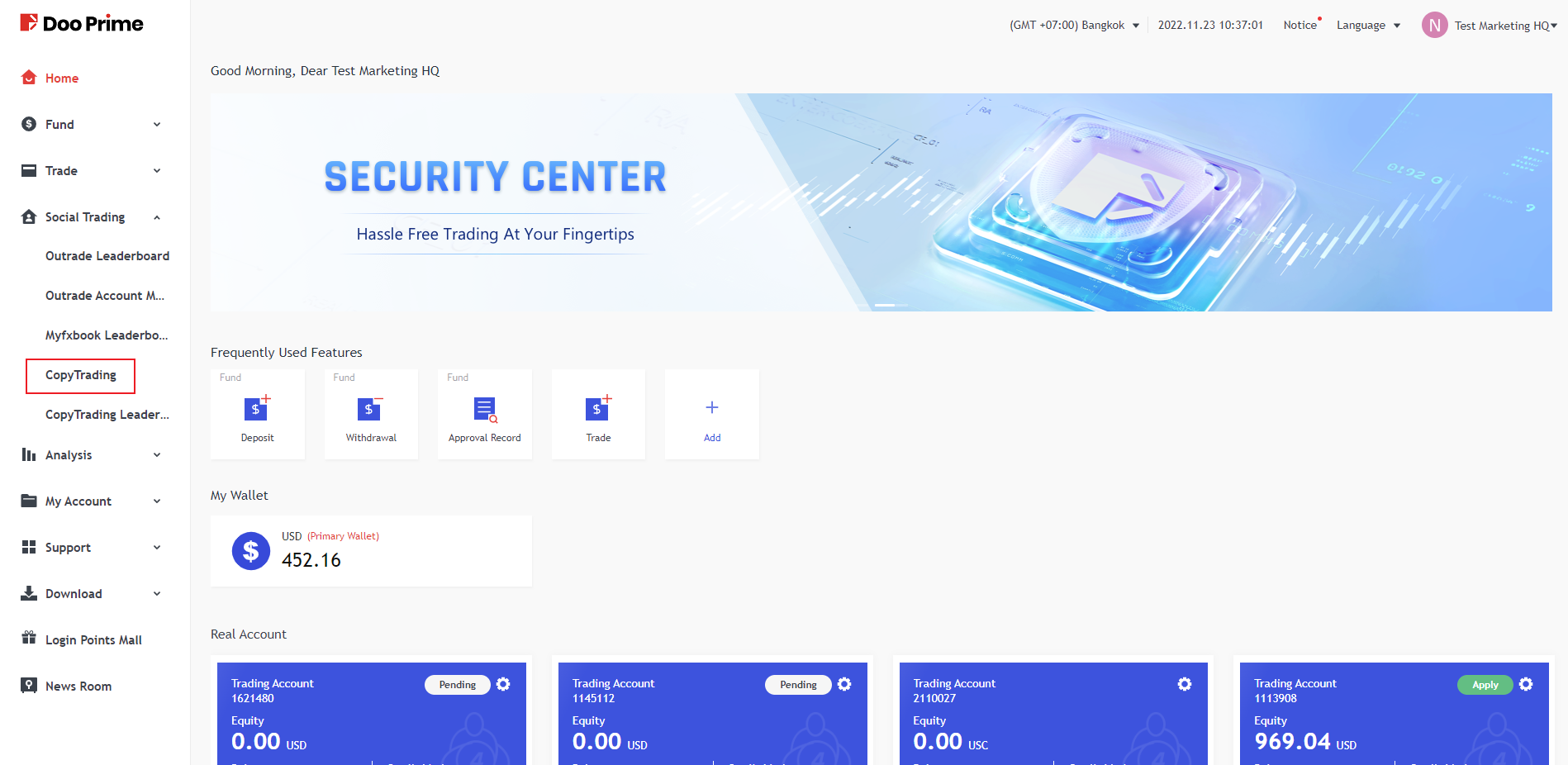 1. Doo Prime User Center의 왼쪽 메뉴바를 통해 CopyTrading 로그인을 선택할 수 있습니다.