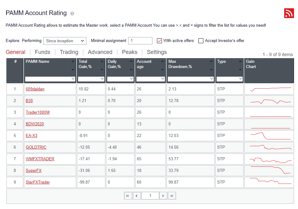 b. PAMM 계정을 정렬하고 가입하기에 가장 매력적인 계정을 찾으세요.