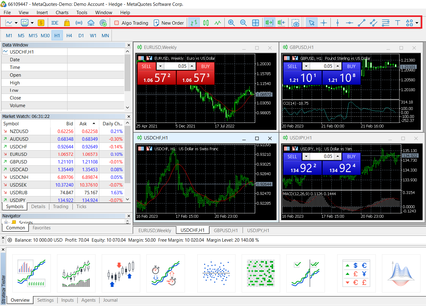메인 메뉴에서 일반적으로 사용하거나 주요 기능은 도구 모음에 위치하여 거래 기호 검색, 주문 입력, 차트 유형 조정 및 그래픽 지표 추가 등과 같이 사용자가 신속하게 작업할 수 있습니다.