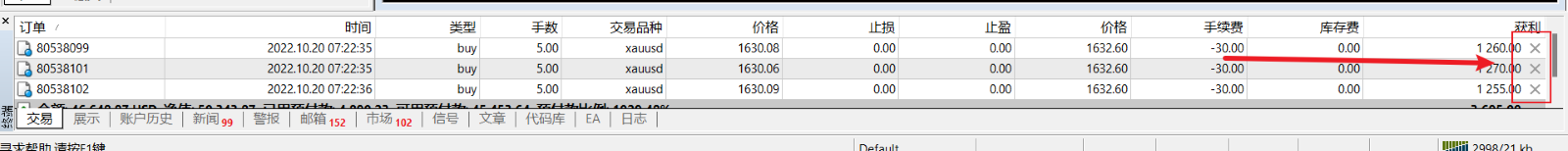 查看方式:在 MT4 底部菜单栏选择「交易」后查看持仓订单末尾如果显示x说明你目前是使用投资密码 (观摩密码) 登录账户