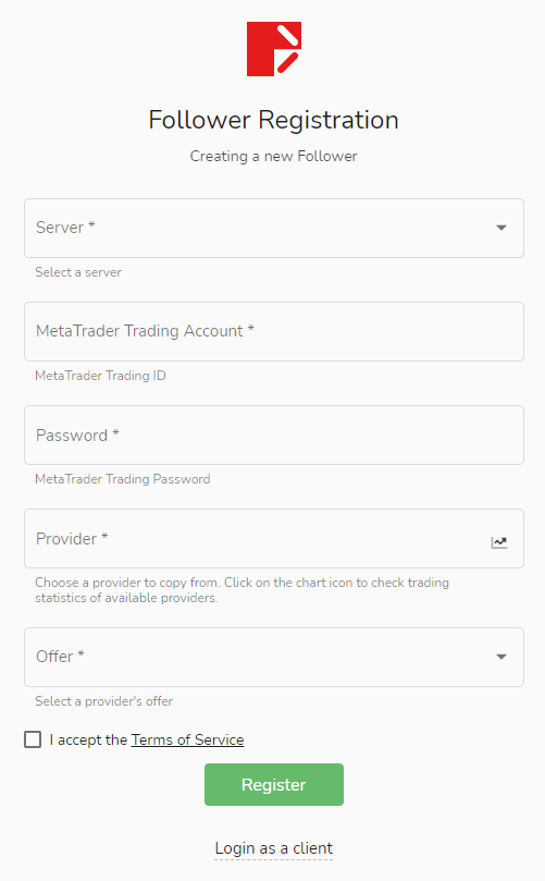 Sau khi đăng ký thành công người theo dõi, hãy nhấp vào [Thêm người theo dõi] ở trên cùng bên phải của trang chính, sau đó lần lượt điền vào [Tài khoản giao dịch], [Nguồn tín hiệu] và [Điều kiện sao chép] và chọn [Tôi chấp nhận điều khoản dịch vụ] .